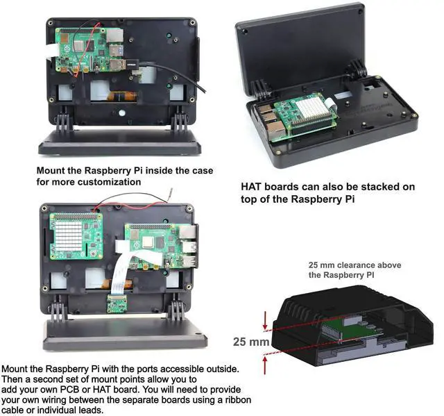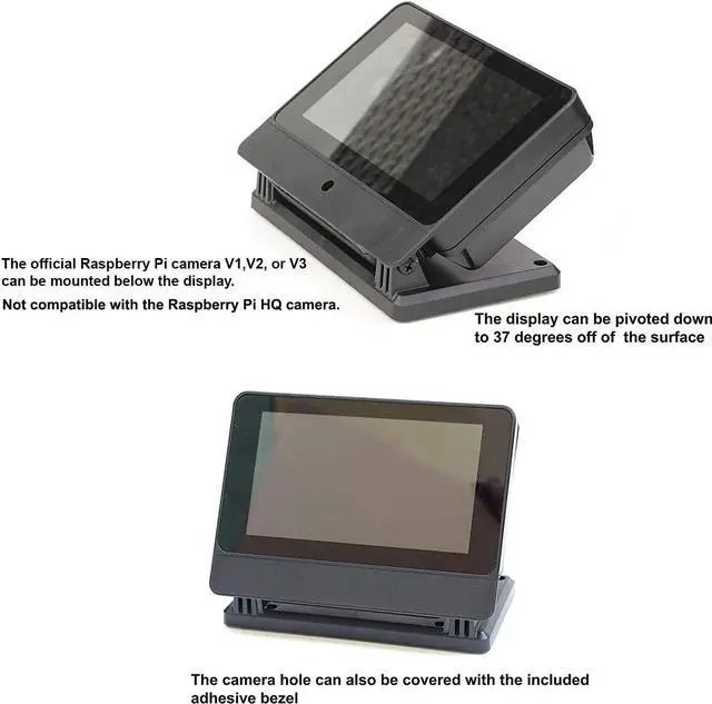 Works with the Official 7" Raspberry Pi display and Raspberry Pi 3, 4, and 5 ^^ Includes a cooling fan with rubber vibration mounts ^^ Raspberry Pi, Raspberry Pi camera, and Raspberry Pi display not included ^^ Weighted base ^^ Works with Raspberry Pi HAT boards and has secondary mounting points for your own development board ^^ Not compatible with Raspberry Pi Touch Display 2