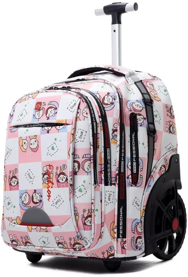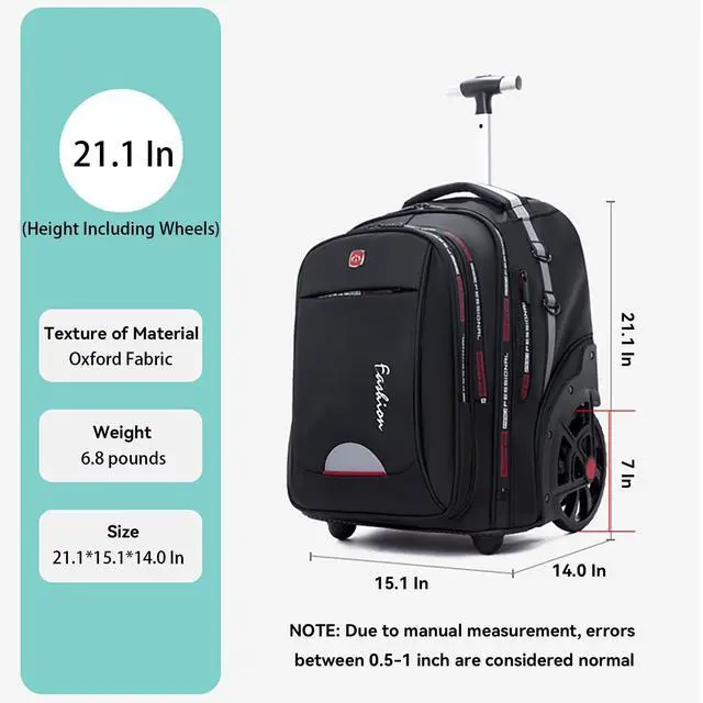 BACKPACK WITH BIG WHEEL: Rolling backpack have large wheels with a diameter of 7 inches (18CM) and a thickness of 0.86 inches ( 2.18CM ). The backpack is very stable to pull and can handle heavy loads, saving labor and time. Easy thru airplane aisles and stair, without worrying about wheels turning sideways or backpack wear and tear ^^ 58L
