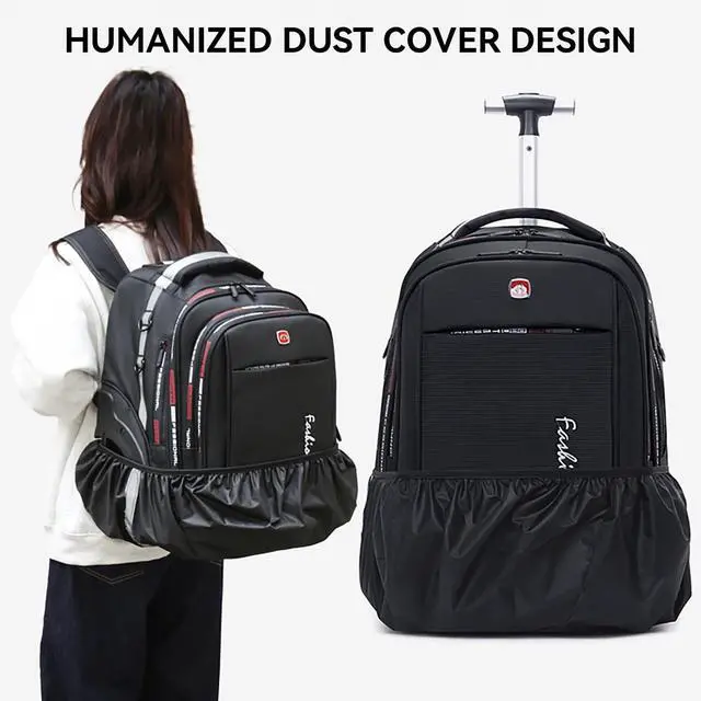 PERFECT DETAILS: Carry On Backpack have ABS Material Handle, better with time, no more worry about handle won't close. Rolling backpack for adults with wheels has a wheel cover, so will not stain your clothes. Our wheeled backpack equipped with adjustable shoulder straps, ergonomic and comfortable. Thickly padded back panel adds support while using as a carry on travel backpack. Hideaway Shoulder strap easy move between cities ^^ NYLON WATER RESISTANT AND REFLECTIVE SAFETY STRIP DESIGN: Nylon Water Resistant Tear Resistant Polyester Fabric And Shock Absorber Strap Design for Adult and Men Women. Roller backpack fit to College, Bussiness, Travel. Reflective Safety Strip Design can be safe in night. It is especially suitable for use in rainy cities and Shuttle between cities ^^