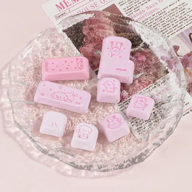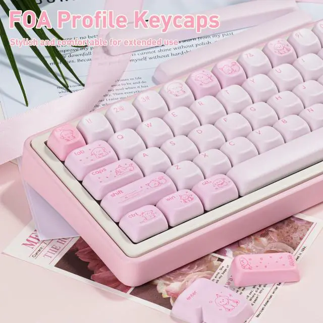 FOA Profile Keycaps: Cute rounded design with enlarged surface area and ergonomic height for comfortable extended typing ^^ Widely Compatible145 keys pink keycaps can be used for most cherry MX switch mechanical keyboards and any keys with "+"Switches, it can fit for 61/64/68/75/84/87/96/98/104/108 mechanical keyboard ^^ PBT KeycapsCute keycaps made of PBT, matte finish, anti-grease, durable and not easy to get dirty ^^ Dye-sublimation ProcessAdvanced dye-sublimation technology allows the color to penetrate into the keycaps, making the font and pattern on the keycaps very clear and beautiful, giving you a premium experience ^^