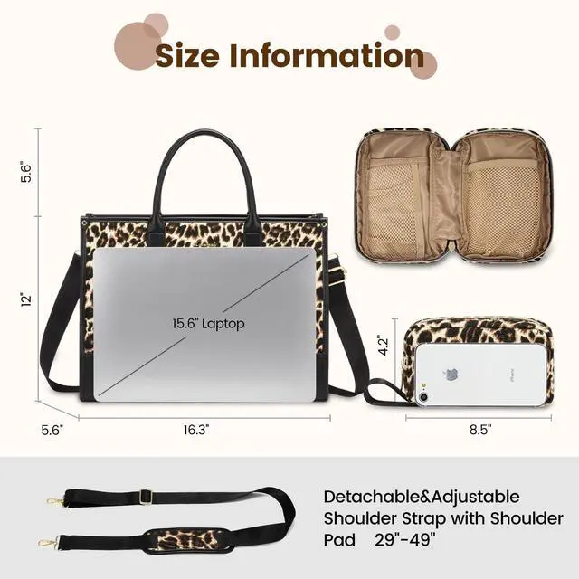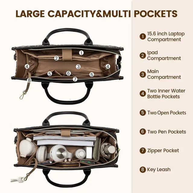 Effortless Organization & Ample Space: This stylish laptop bag for women (Dimensions: 16"L x 12"H x 5.6"W ) is designed to cater to your organizational needs. Laptop purse boasts well-padded compartments perfectly suited for A4 documents, folders, a 15.6" laptop, and a 13-inch tablet, ensuring their safety during transport. With specialized pockets for water bottles and umbrellas, along with a convenient keychain holder, everything has its dedicated place. ^^