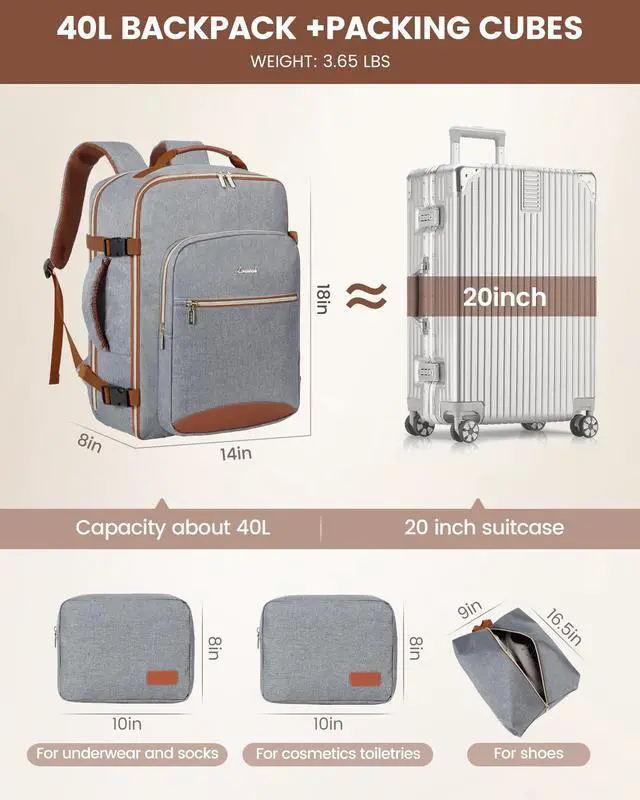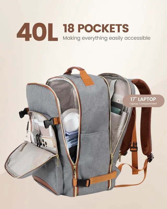 Large Capacity & Multiple Pockets: The travel backpack has a 40L large capacity and 4 main compartments, which can meet daily and travel needs. The travel backpack for women's main compartment can store a lot of things, including 5-8 pieces of clothing, shoes, books, and many other items. The separate laptop compartment is padded with EVA foam to provide the best protection for your 17" laptop and 12.9" iPad. The front compartment has many pockets to keep your belongings organized. ^^