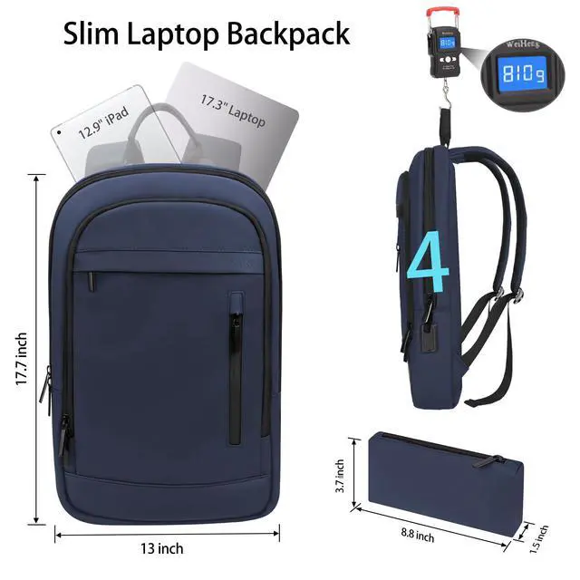 Perfect SizeThe size of the laptop backpack is 17.7 *13*4in, and ONLY 1.8 lb. (This lightweight business backpack is only for 17.3 inch laptop, Please check the SIZE before purchasing). This slim backpack also comes with an additional 8.8 * 3.7 * 1.5 inch pouch. Lixiin waterproof backpack is suitable for work, commuting, traveling. This travel backpack is a gift for men/women! ^^ Fashion DesignMeticulously designed by our team, this slim mens backpack is truly one-of-a-kind.. In the front of the waterproof backpack there is a unique pouch designed for storing your data cable car keys headphones etc.