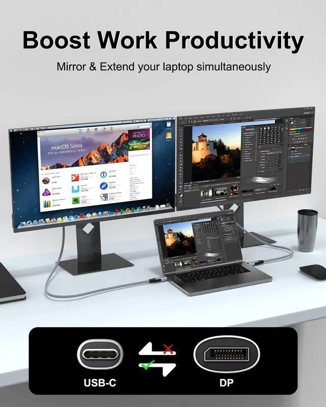 Note: Only Supports undirectional USB-C to Display Port ^^ [40Gbps DP 2.1 Cable] This USB Type C to Display Port cable offers a quantum leap in transfer speeds from 21.6G bps to 40Gbps. With stable signal transmission, the USB C to DisplayPort cable ensures amazing sound and image quality, and an end to screen flickering, Elevate your gaming experience with crystal-clear, high-resolution. It Supports HDR, DSC 1.2, HDCP 2.3, VRR and ALLM, eARC, DTS and Dolby ^^ [Multi-screen Display] The Thunderbolt 4/3 to DisplayPort cable supports Multi-Stream (MST) for daisy chaining multiple monitors, It supports mirror & extend mode and also supports Macbook Clamshell mode with just power on. DSC 1.2 a enables you to enjoy high-resolution and frame rates video through existing physical interfaces.