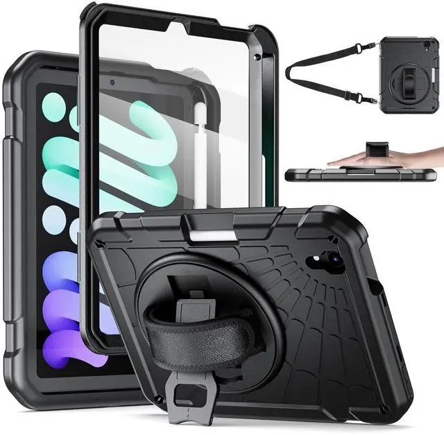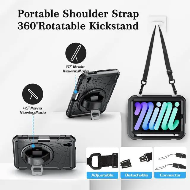 Compatibility: Exclusively designed for New iPad Mini 6 Model (A2567/A2568/A2569) 8.3 inch, 2021 released. Only Support 2nd Gen Apple Pencil Charging. Please confirm the product before purchase. ^^ Soft Hand Strap & Portable Shoulder Strap & Rotating Stand: Provide the securest protection and more convenience when you play or work with iPad Mini 6 2021. Hang it anywhere for your better entertainment, make your hands free. 360-degree rotating Kickstand provides multi-angle viewing, with a soft handle strap, easier to use your iPad in your outdoor traveling, working, and gaming with kids.