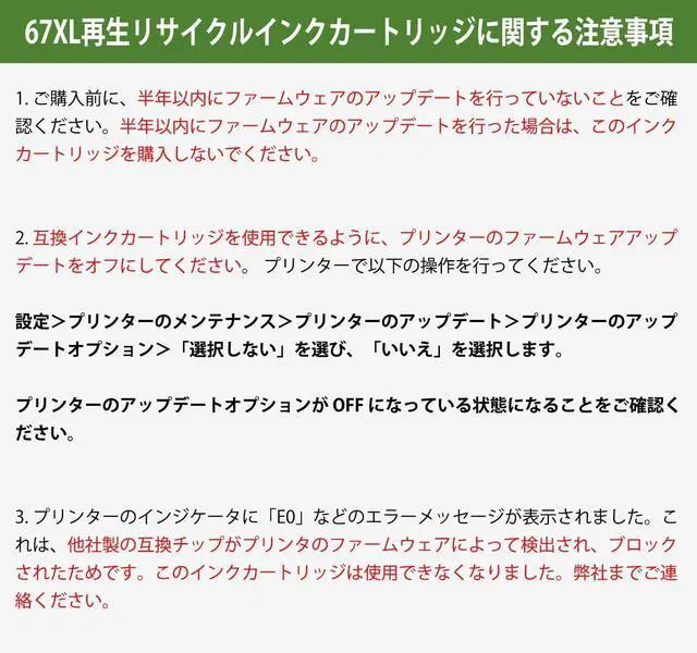 Reliable quality: By over 20 years of production experinece, innovative technology, cost-effective materials and excellent workmanship, we provide high quality compatible toner cartridges that are more professional, cost-effective and durable. ^^ Precautions Regarding 67XL Remanufactured Ink Cartridges. Before purchasing, please confirm that you have not performed a firmware update within the past six months. If a firmware update has been carried out within the last six months, do not purchase this ink cartridge.. To ensure the compatibility of third-party ink cartridges, please disable the printer's firmware update feature. Perform the following steps on the printer: Settings > Printer Maintenance > Printer Update > Printer Update Options > Select "Do Not Update" and choose "No. " Ensure that the printer update option is turned OFF. ^^. If an error message such as "E0" appears on the printer indicator, this indicates that the non-original compatible chip has been detected and blocked by the printer's firmware. This ink cartridge can no longer be used. Please contact us for further assistance.