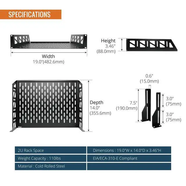 Sturdy: 19"W x 14"D x 3.46"H, this 2U shelf is made from 1.5MM thickness cold rolled steel; Electrostatic powder coat preventing rust and corrosion; Reliable and durable ^^