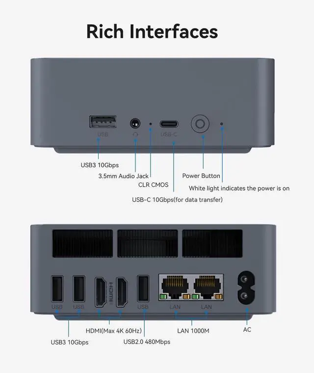 Offers an excellent performance and smooth operation when you do heavy loading work. ^^ Support 4K & dual screen displayThe mini desktop computer equipped with 2*HDMI port, makes it easy to connect two monitors at the same time, and you can do mulit-tasking, which will improve your work effeniency. ^^ Reliable Network Speed and ConnectionBeelink EQi12 mini computer adopts 1000M bps Ethernet LAN port*2, USB 3.2 Gen2*3 port, which provides high speed and reliable data transfer. Equipped with a BT 5.2 adapter Wi-Fi 6 ( 802.11 ax), greatly improve wireless network performance and maintain stable and reliable Wi-Fi speed and stays connected well to all your wireless accessories.
