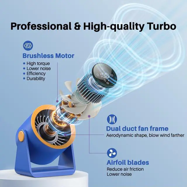 The intuitive LED screen also lets you monitor the remaining battery life at a glance. Combines smart functionality with sleek design for ultimate convenience! ^^ - This fan features advanced noise reduction technology, equipped with a brushless DC motor for frictionless performance and a winglet fan design that reduces turbulence, it operates at a whisper-quiet 28dB. Peaceful Cooling for your bedbeside, offices, or any space where tranquility matters! ^^ The rechargeable fan is powered by a robust 15200mAh battery, small but mighty cordless fan keeps working up to 30+ hours of runtime on low speed, must-have ideal for outdoors, unexpected power outages, or even during extreme weather conditions like hurricanes.