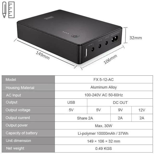 No Standalone lithium batteries are sold with the product. ^^ Mini uninterrupted power supply for power outage, compatible with router, modem, security camera, telephone, fax, printer, fingerprint recorder, LED strip lights, ect, and can still use the network in case of power outage. ^^ Alumimum housing, Input: 100~240V AC, Output maximum 60W, with 5V USB 2A, 5V DC 2A, 9V DC 2A, 12V DC 2A. ^^ Built-in 10000mAh 37Wh with a standard USB port, can be used as a normal power bank as well.