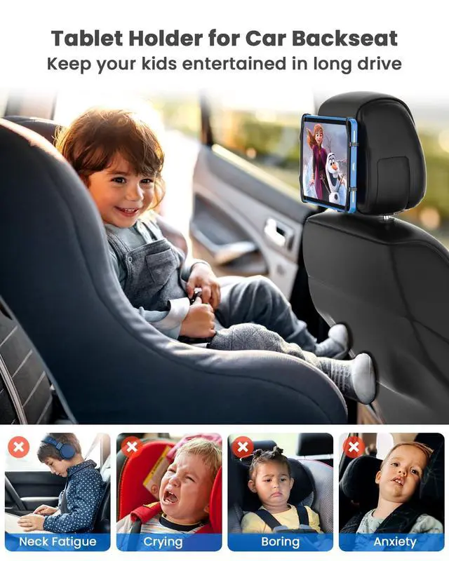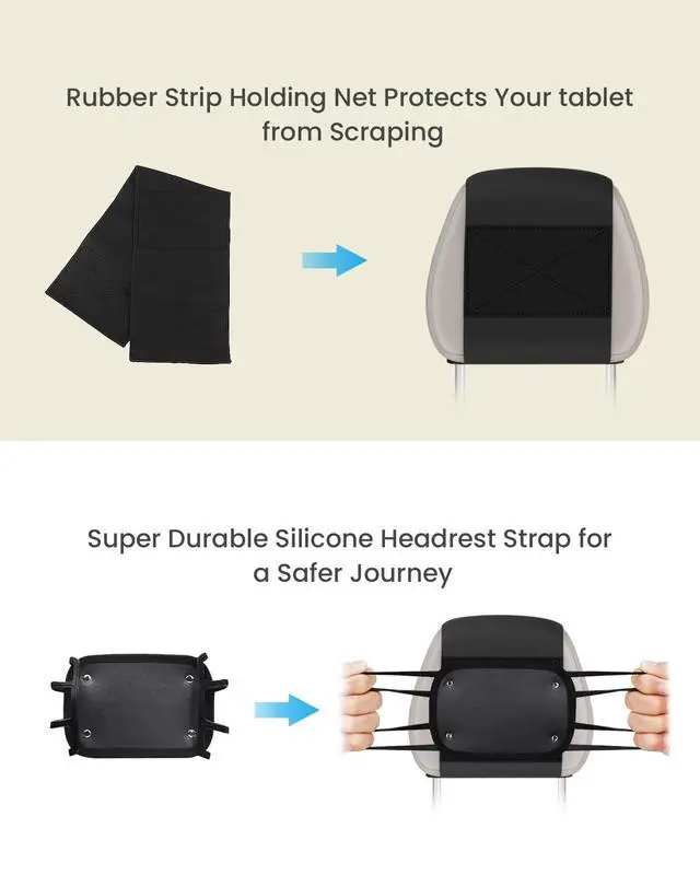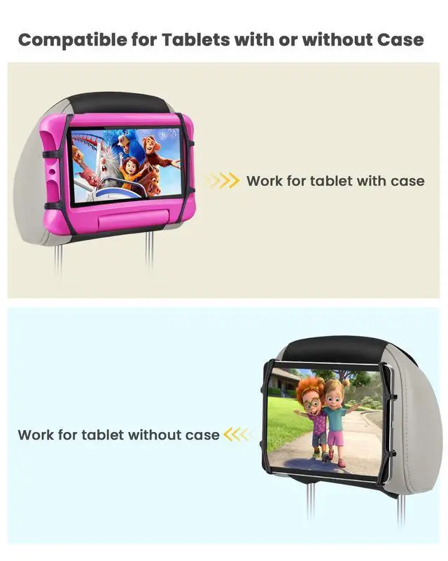 4 Pack Car Headrest Tablets HolderInstall in car backseat to hold your tablet. This tablet mount not only keep your kids entertaining in whole trip but also avoid neck fatigue of holding a tablet ^^ Works Well with Various TabletsWorks well with all 7- 12.9 inch and the thickness less than about 0.7 inches tablets or other entertainment devices ^^ Simple & SafeEasy installation without any tools. Extensible strap fits most car headrests and holding net hold your tablet tightly, NO Scratches and Falling Anymore ^^ Horizontal & Vertical ViewRemovable design supports two installation modes, tablets can be installed horizontally or vertically, meets different view modes ^^ Warranty&PackageWONNIE provided 365 Days Return Policy.