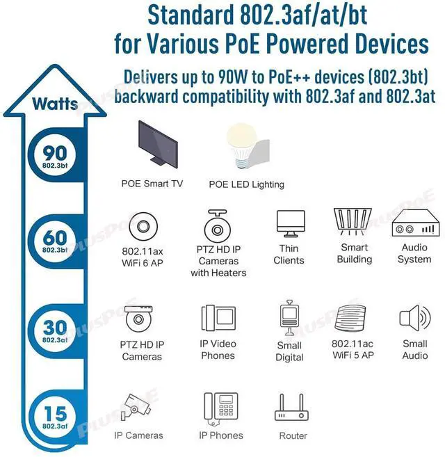 Applications: Compatible with IP phones like Polycom, Cisco, YealinkWireless Access point and client devicesCompatible with Security IP Camerasany 802.3 af/ 802.3 at/ 802.3BT