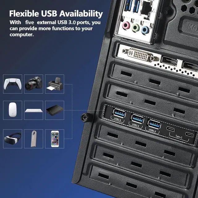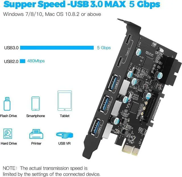 6 Ports USB Expansion Card Add 3 USB C, 2 USB A and 1 Internal 19 pin connector to the PC via PCIe x1 slot. Can Connect multiple devices at the same time, 19 pin can be connected to the USB A interface on the front panel of the case ^^ Fast and efficient USB 3.0A dvanced smart chips, Support up to 5Gbps transmission speed, Transfer videos, photos, files, etc. between the USB device and the computer to achieve higher efficiency ^^ Wide Compatibility This PCIE expansion card compatible with PCIE 3.0 PCIE 2.0 and PCIE 1.0 motherboards, Operating System Supports Windows 7, 8, 10.