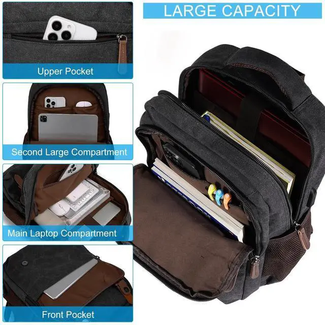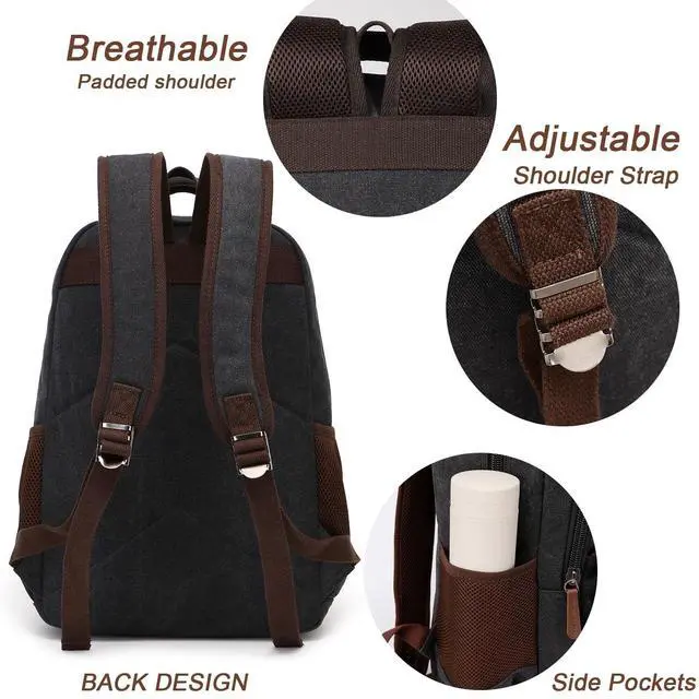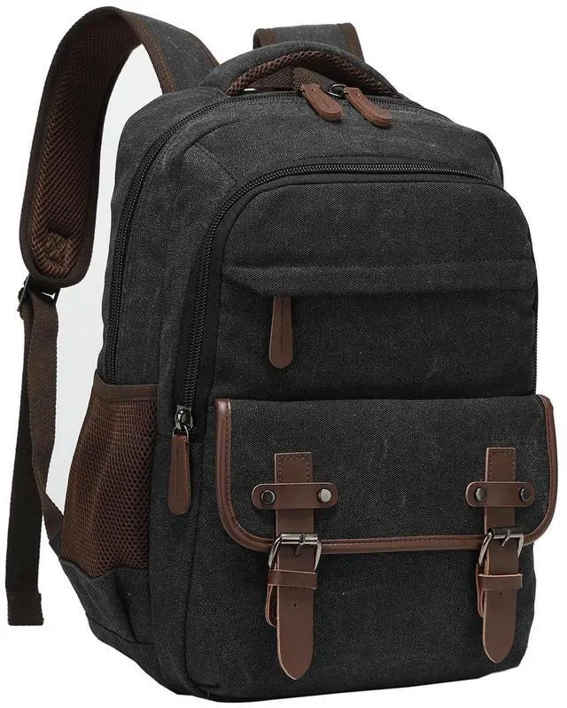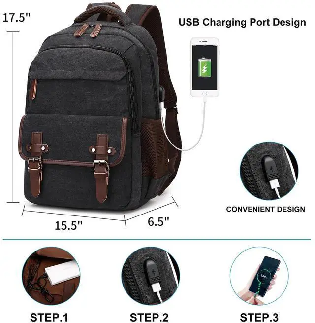 VINTAGE DESIGN & DURABLE MATERIAL: This black canvas laptop backpack with USB charging port features a classic magnetic snap in the front, while opening and closing the bag more convenient add the bag a vintage look. Made of high-density ripstop canvas and vegan leather trim with solid hardware, it's multi-functional, durable, and lightweight.