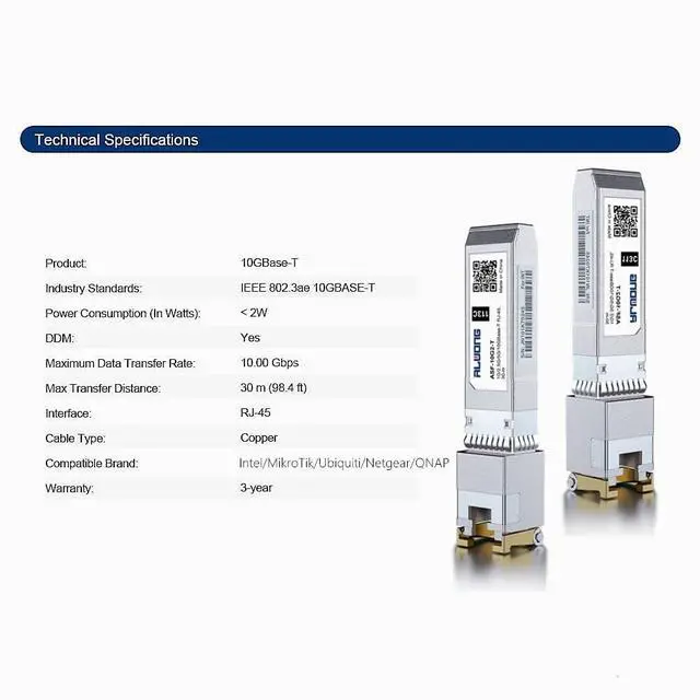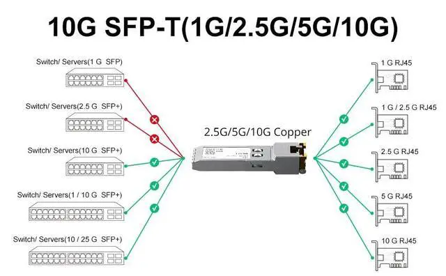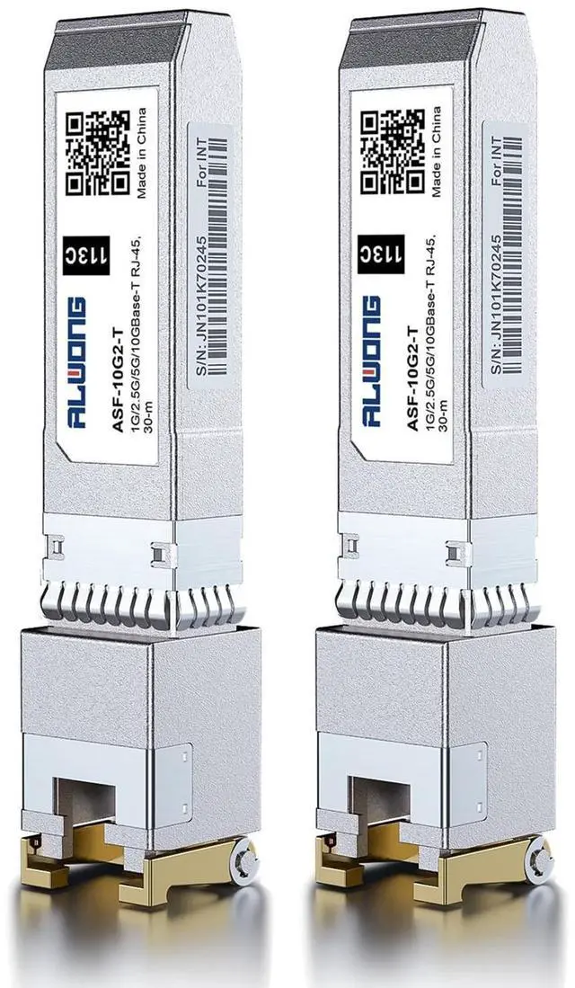 Data Ratemulti-rate, 2.5G b/5Gb/10Gb. Supprots 10Gb rate up to 30m via Cat. 6a/ Cat. 7 cable. Supprots 5Gb/ 2.5G b rate up to 50m via Cat. 5e cable. 2-Pack. ^^ Protocols CompliantHot-pluggable, 0 to 70, RoHS compliant and lead-free, Compliant with IEEE 802.3 an, IEEE 802.3 az, SFP+ MSA, SFF-8431. ^^ Low Power ConsumptionLow Power Consumption < 2.5W, EMC Support, Anti Electro-Static Discharge and Radiation Resistant. ^^ Technical Support3-year Warranty, 30-DAY Free-return, Free Lifelong Technical Support.