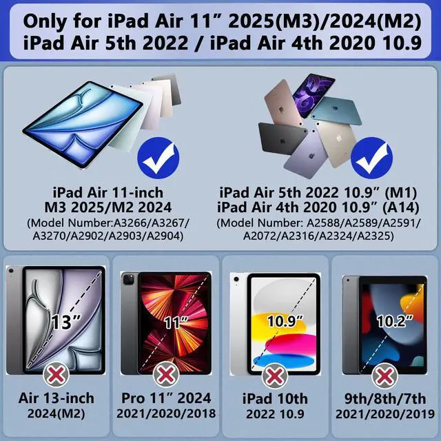 Compatibility: It's only designed for iPad Air 11-inch (M3) 2025 / (M2) 2024 and iPad air 5th/4th generation (Air 10.9 inch 2022/2020).