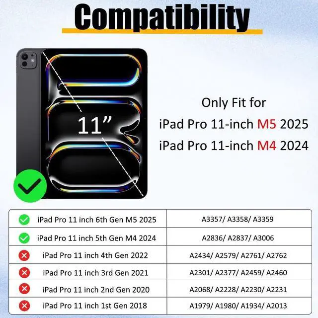 NOTICE: Not compatibility for iPad Pro 11 inch 4th/3rd/2nd/1st Gen 2022/2021/2020/2018, check the model number on the back of tablet (A****) before purchase.