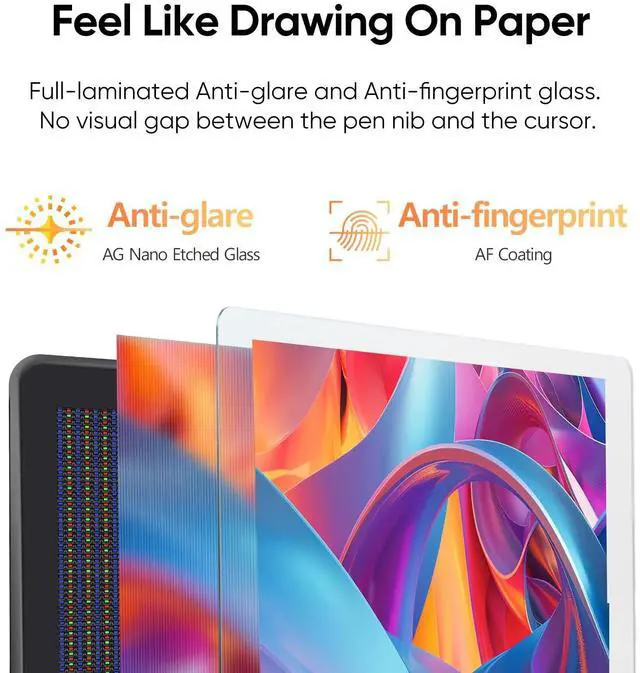 Paper-Feel Drawing Experience: The AG Nano Etched Glass offers a smooth, canvas-like feel, eliminating glare and distractions for both professionals and hobbyists. With a peak brightness of 250 cd/ and a 1000:1 contrast ratio, it enhances detail and ensures vibrant visuals. Additionally, DC dimming technology reduces eye strain during extended use, creating an ideal environment for uninterrupted artistic creation ^^ Word-first 16K