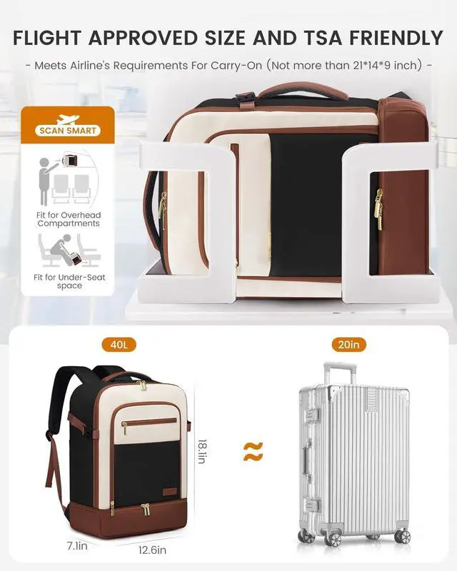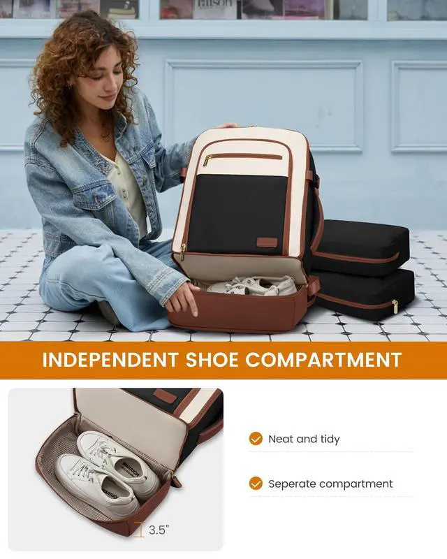 INDEPENDENT SHOE COMPARTMENT & 2 FREE PACKING CUBESThis carry on backpack for women comes with 2 packing cubes to store your underwear or toiletries. Separate flat bottom compartment of this travel bags for women can hold your shoes or dirty clothes for easy separation from clean clothes when traveling. Ideal for travel, business trips, or daily use. ^^ LARGE BACKPACK WITH MULTIPLE POCKETS This 40L travel backpack easily fits 3-5 days' worth of travel essentials. It features multiple compartments, including quick-access document pockets, a hidden theft-proof pocket, and a suitcase-style 180 opening main compartment that holds 5-10 sets of summer clothes, complete with two storage bags for organization.