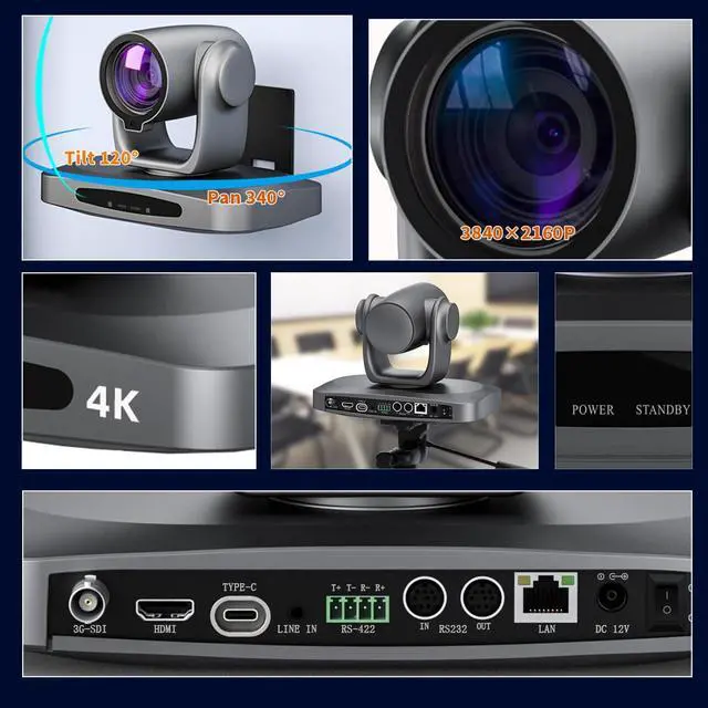 g., podium/auditorium/exhibition area), the PTZ camera automatically cycles between positions without manual input, greatly enhancing efficiency for church ceremonies, classroom recording. ^^ Multi-Function Remote Control Included with this 4K conference camera, the remote allows basic control (pan, tilt, zoom) and access to the camera menu for parameter configuration. ^^ Multi-Protocol CompatibilityPTZ camera Supports RS-232, RS-422, RS-485, and UVC protocols over network control. Also compatible with SRT, RTMP, VISCA, PELCO-P/D, and other industry-standard protocols for seamless integration into existing systems. Operable via PTZ controllers, central control systems, video conferencing platforms, and live streaming software.