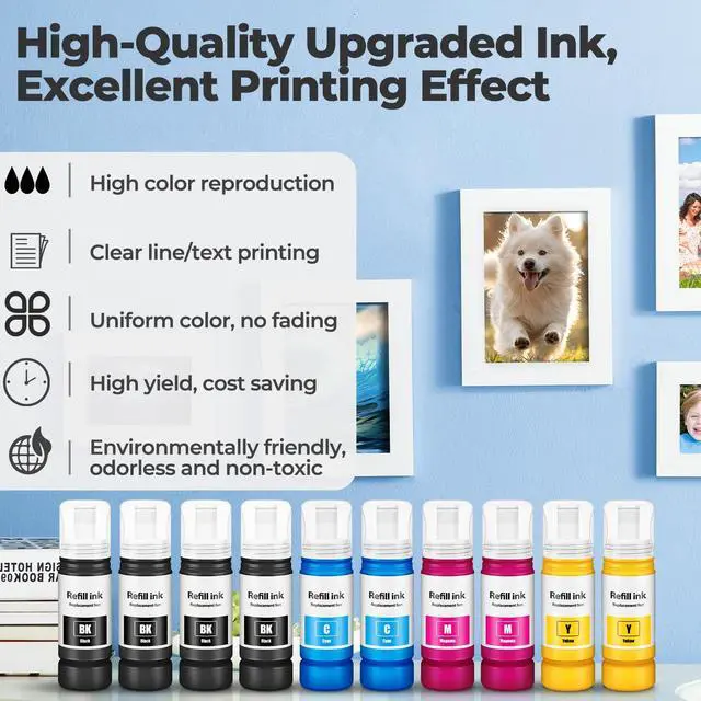^^ Advantage: The ink refill bottles are designed with an automatic water-stop nozzle that makes filling easy and convenient, with no spills or drips, and delivers outstanding vibrant prints with long-lasting, brilliant colors, as well as clear, sharp text and vivid black prints.