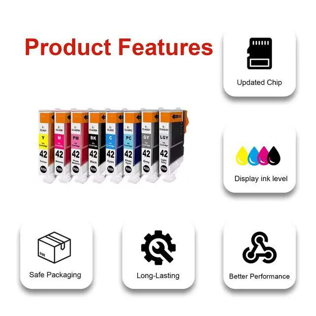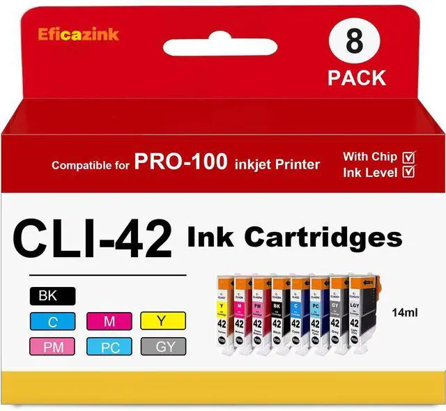 PACKAGE CONTENTS 1CLI 42 Black Ink Cartridge, 1CLI 42 Cyan Ink Cartridge, 1CLI 42 Magenta Ink Cartridge, 1CLI 42 Yellow Ink Cartridge, 1CLI 42 Photo Magenta Ink Cartridge, 1CLI 42 Photo Cyan Ink Cartridge, 1CLI 42 Gray Ink Cartridge, 1CLI 42 Light Gray Ink Cartridge ^^ PRINTER COMPATIBILITY PRO-100 PRO-100S Printers ^^ PAGE YIELD Black 14ml; Color 14ml at 5% coverage (letter/A4) ^^ PRODUCT FEATURES Long-lasting durability. Keeps your printouts looking professional ^^ PACKAGING DESIGN The product may differ from the website images due to regular design updates, but the product itself remains unchanged ^^ AFTER-SALES SERVICE We stand behind our products.