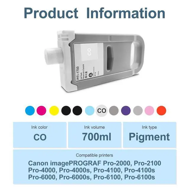 Tpye: PigmentCompatible printercompatible with Canon imagePROGRAF PRO-2000, PRO-2100, PRO-4000, PRO-4000s, PRO-4100, PRO-4100s, PRO-6000, PRO-6000s, PRO-6100, PRO-6100s