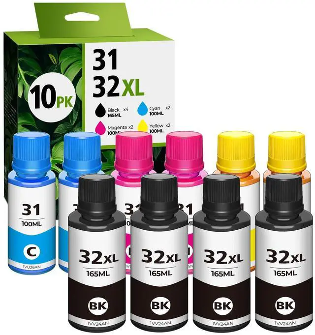 Higher Page Yield: The page yield of our 32xl black ink bottle refill is up to 9500 pages, the 31 cyan ink bottle is up to 9000 pages, the 31 magenta ink is up to 9000 pages, the 31 yellow ink refill bottle is up to 9000 pages, at 5% coverage on A4 paper.