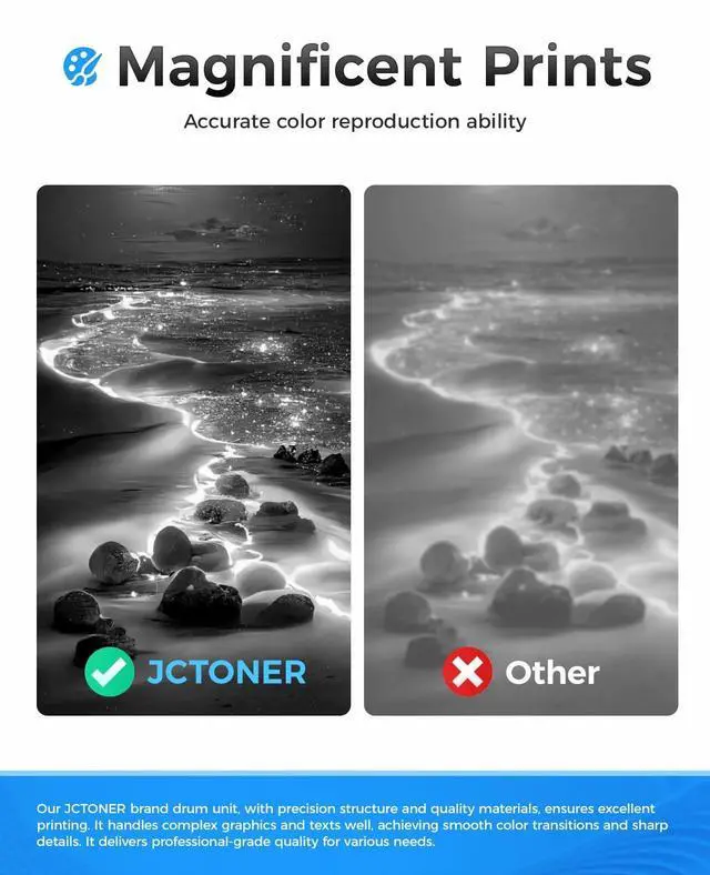 The latest chip version: The JCTONER toner cartridges are equipped with the latest version of built-in chips, ensuring perfect compatibility between each toner cartridge and the printer. This enables you to print efficiently while maintaining stability and reliability, making installation convenient without the need for manual adjustments. All JCTONER toner cartridges have undergone strict quality testing and have obtained ISO9001 certification. High-quality toner cartridges can meet the demand for high printing volume. The fine toner ensures clear and stain-free printing results and extends the lifespan of the printer. You can purchase with confidence.
