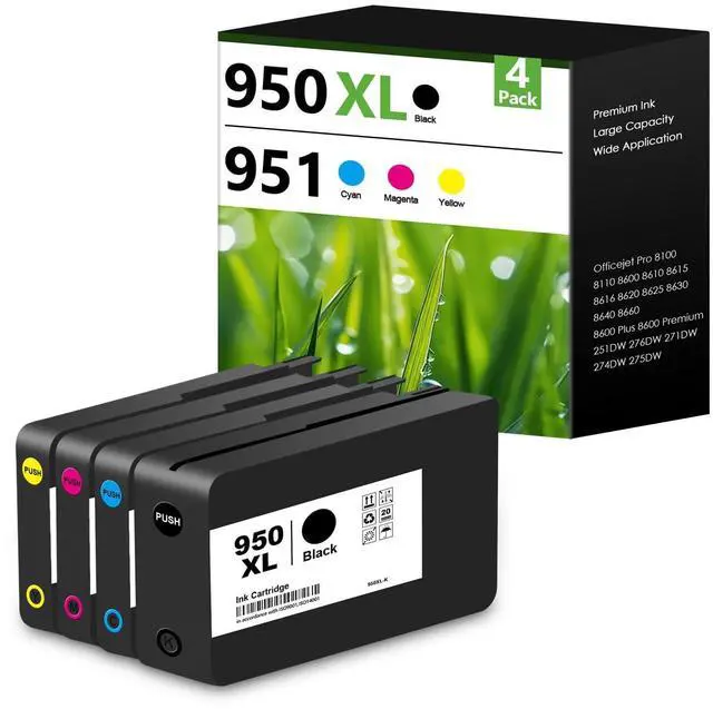 Package Includes: 4 Pack ( 1 x 950XL Black ink cartridge, 1 x 951 Cyan ink cartridge, 1 x 951 Magenta ink cartridge, 1 x 951 Yellow ink cartridge).