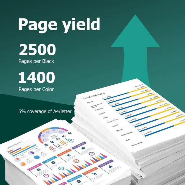 Cartridge high yield per cartridge: Up to 2500 pages per black ink cartridge; Up to 1400 pages per ink cartridges for hp printers cyan magenta yellow (at 5% coverage on A4 paper)