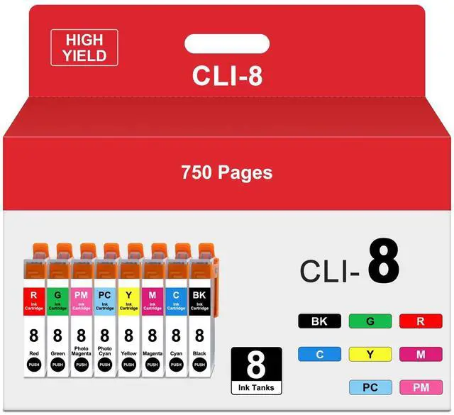 Package Content: 1 x Black CLI-8, 1 x Cyan CLI-8, 1 x Magenta CLI-8, 1 x Yellow CLI-8, 1 x Photo Cyan CLI-8, 1 x Photo Magenta CLI-8, 1 x Red CLI-8, 1 x Green CLI-8 ink cartridges