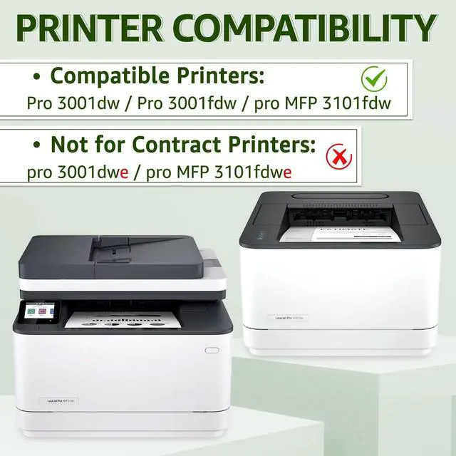 ^^ Warning: NOT COMPATIBLE WITH Contract Printers (HP+ service) suffix with Letter "e", such as Pro 3001dwe and MFP 3101fdwe Printers. Please confirm your printer model before ordering.