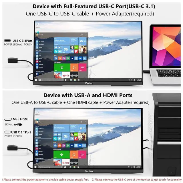 USB Connection** (For broader compatibility): Connect power adapter HDMI cable for video USB-A to USB-C cable for touch functionality.