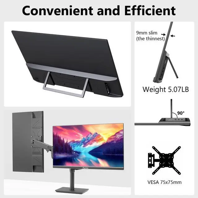 Portable Design**: The built-in foldable stand adjusts up to 90 for optimal viewing angles in landscape or portrait mode. Slim, lightweight construction with ultra-thin bezels makes it easy to carry for travel, remote work, or extending your laptop setup. Also supports 75x75mm VESA mounting. ^^ **Plug-and-Play