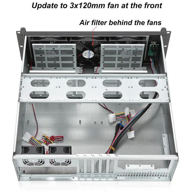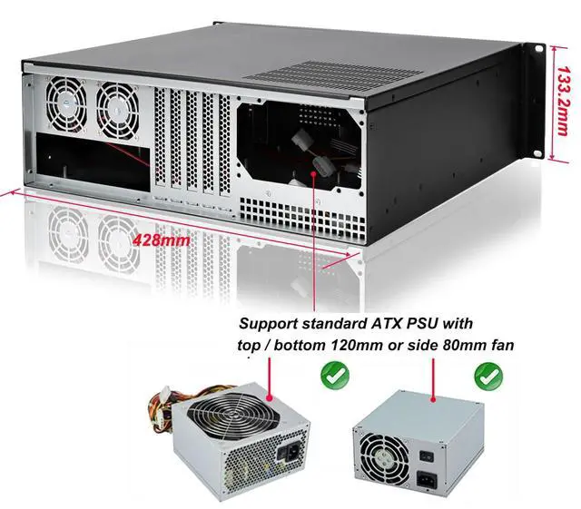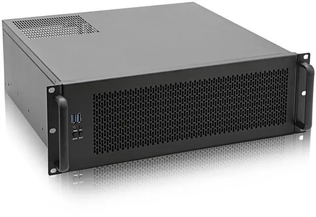 Material: Front Bezel+ handel Aluminum; Main Chassis- Zinc-Coated Steel ^^ 2 x front access USB 3.0 (compatible with USB 2.0 ) ^^ Support Standard ATX PSU with either top or side cooling SFX PSU (using the ATX to SFX bracket with chassis) ^^ Support GPU size 128mm (H) x 250mm (L) not remove HDD bracket / 368mm (L) if remove HDD bracket ^^ 3U rack mount chassis depth=420mm / 16.53" not includle handle
