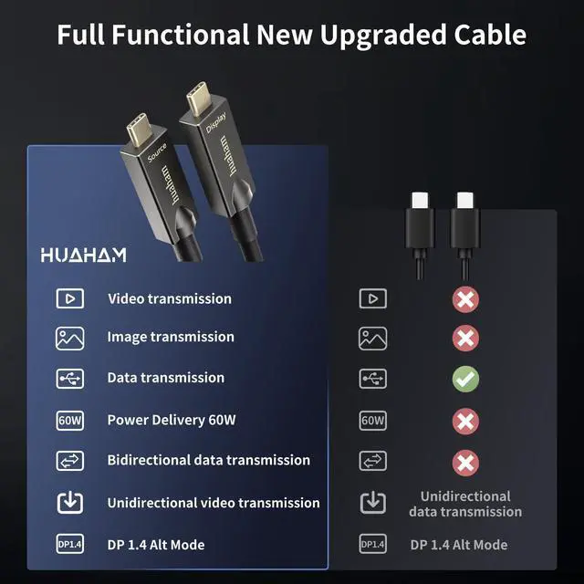 Full Featured USB C Fiber Optic Cable USB C Cable 10Gbps signal transmission, supports 60W power supply, integrated charging, and transmission, no need for additional cable power supply. 2-way DP 1.4, supports data, audio, and video signal transmission. Anti-electromagnetic interference, zero data loss. ^^ 4K@30Hz Video OutputUSB 3.2 video cable supports 4K@30Hz video output for laptops to monitor, and enjoy videos and movies on a larger screen. Note that both the laptop and monitor must support 4K resolution. ^^ High ReliabilityZinc alloy shell of USB C to USB C cable for better insulation.