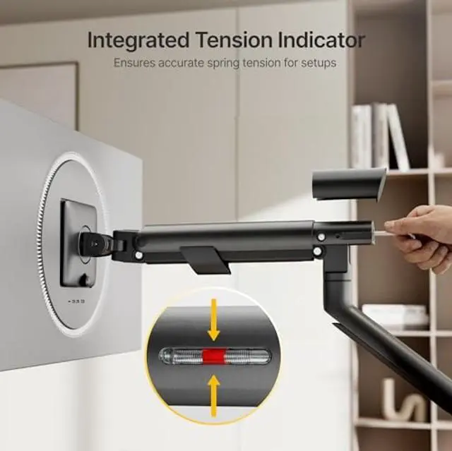 Visual Tension Clear Display: Our monitor mount's unique visual spring tension indicator shows you the exact support level, so you never over tighten or under support your monitor. Every spring is tested over 25, 000 cycles for lasting precision. Match the arms strength to your screens weight in seconds and enjoy a flawlessly balanced setup that stays consistent year after year. ^^ Your Monitor, Securely