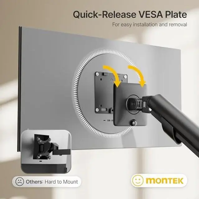 Monitor Arm: Forget bending or crawling. Mount the C-clamp or Grommet of your single monitor arm completely from above, then secure your monitor in seconds with the quick-release VESA plate. The entire desk monitor mount is designed for a fast, smooth, and truly one-person installation.
