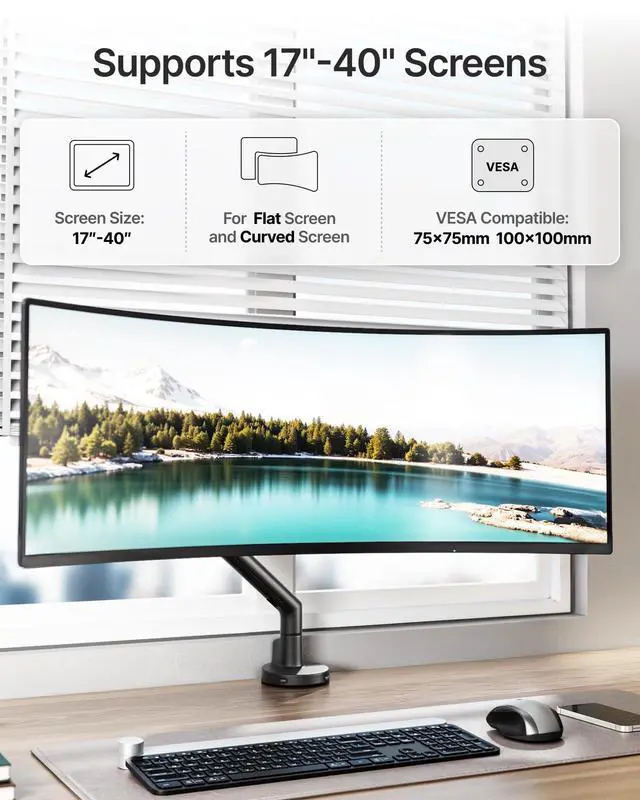 Mounted: Crafted from aerospace-grade aluminum alloy and reinforced steel, this VESA monitor mount delivers rock-solid stability for 17" to 40" screens up to 24.3 lbs (22 lbs for curved displays). Fully compliant with VESA 75x75mm and 100x100mm standards, this VESA mount is built to securely hold your monitor in demanding professional, gaming, and office environments. ^^ Complete Freedom of