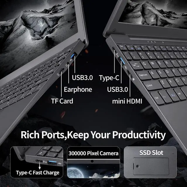 Connection Ports: This laptop with a 5000mAh battery, it offers 4-5 hours of continuous use. Abundant connection options include dual-band Wi-Fi, Bluetooth 5.0, 2x USB 3.0, mini HDMI, headphone jack, TF card slot, and Type-C for fast charge. A feature-rich and convenient device for on-the-go productivity ^^ Quality Assurance &