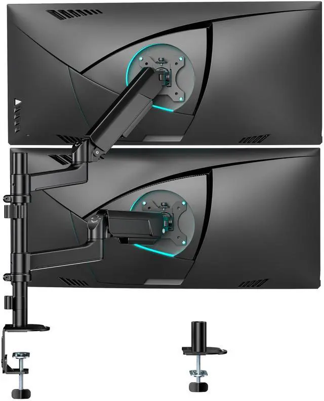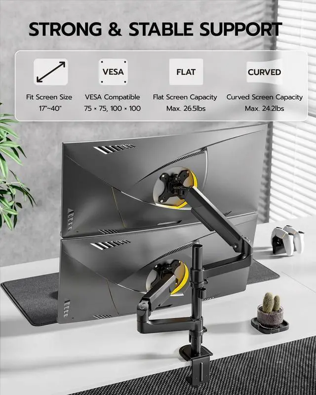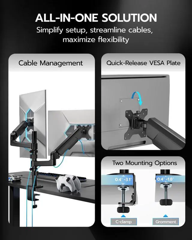Durability and Strength - Ares Wing dual Monitor arms supports up to 26.5 lbs and fits 17-40 inch ultrawide curved screens displays, ideal for gaming setup and office workstation. Its internal mechanical spring undergoes 25, 000+ fatigue tests, ensuring long-lasting stability for heavy-duty use. ^^ Integrated Cable Management - Maximize your desk space with a dual-monitor mount featuring built-in cable management that hides wires, creating a clutter-free gaming setup. ^^ Quick Installation - The quick-release VESA plate for simple monitor installation. Effortless setup via "Fix Base Attach Arm Mount Monitor" steps.