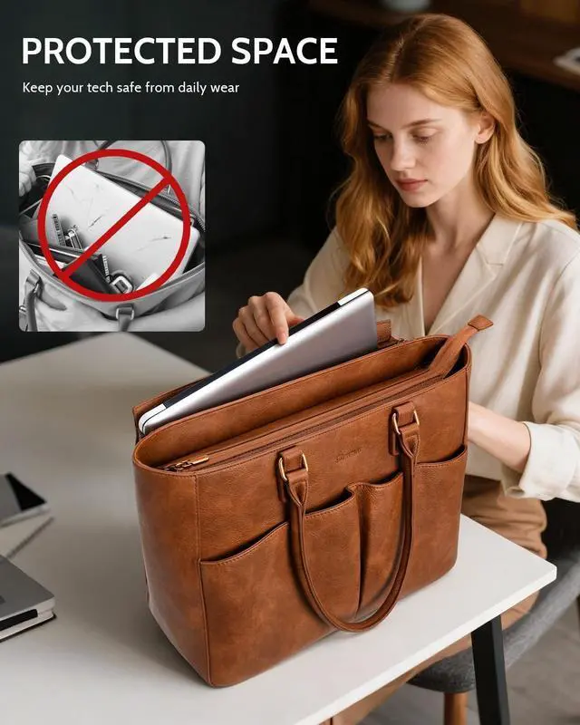 ^^ Designed for Real Life, Down to the Last Detail We thought of everything. A base that stands firm on its own, so it never tips over under your desk. A durable, water-resistant exterior that laughs off spills and splashes. This isn't just a leather laptop tote; it's a thoughtfully crafted accessory designed to make your everyday life noticeably smoother and more stylish.