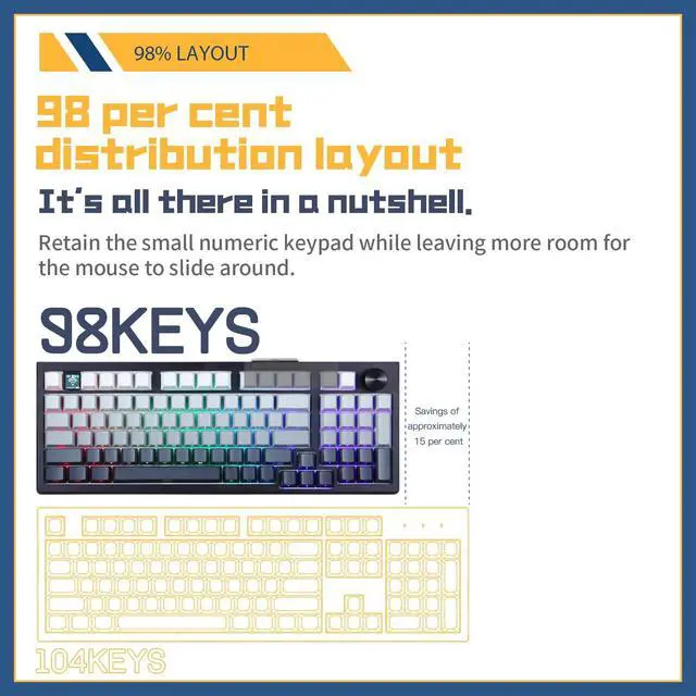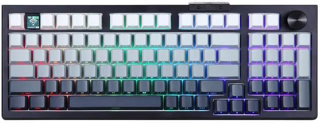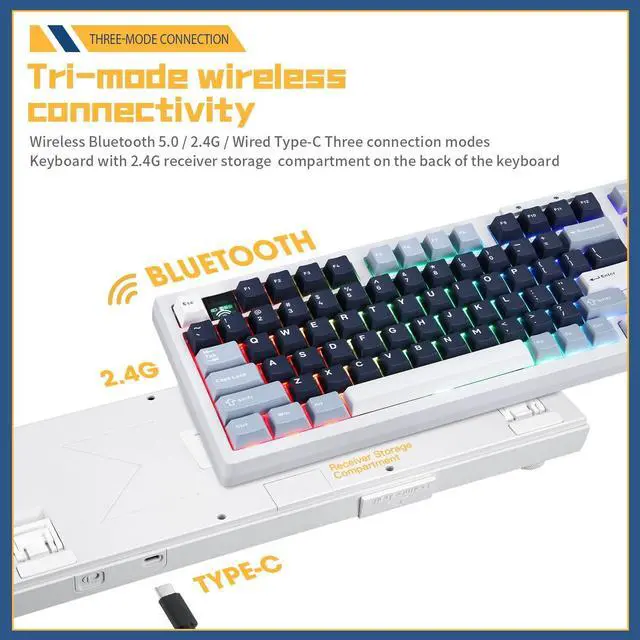Compact 98% LayoutA compact, wireless mechanical keyboard with 98% RGB backlight (98 keys) with classically opaque, high profile and opaque PBT spherical keys. which have much higher strength and oil hardness than ABS keys, without Numpad, more practical for players and typists, frees up more space for your desktop. ^^ BT 5.0 / 2.4G /USB-CThis is the first generation of three-mode wireless keyboards on the market. Wireless mode with stable Bluetooth 5.0, trouble-free 2.4G hz dongle and USB-C wired mode set no limits on keyboard connection. ^^ Fully DIY- Hot SwappableAllowing you to enjoy the fun of building a highly customized mechanical keyboard that perfectly adapts to your typing habits and gaming anytime, anywhere.