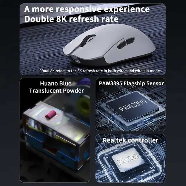 • PAW3395 SensorDarmoshark wireless gaming mouse adopts top 3395 sensor, up to 26000 DPI resolution, 650 IPS tracking speed, response speed can reach 8000Hz, 50G acceleration, faster and more accurate than ordinary mouse, is committed to providing PC gamers the best Gaming experience.