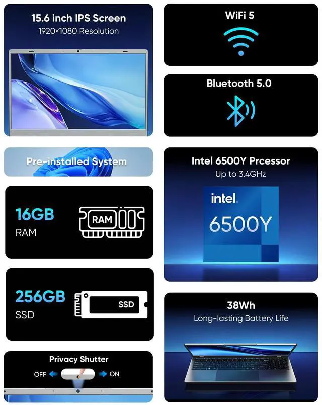 Processor: Efficient Performance for Daily Tasks ] Powered by the Pentium 6500Y processor, this laptop delivers reliable, low-power performance ideal for daily use. It handles essential tasks like web browsing, document editing (Word/Excel), video calls, and video streaming with easebalancing speed and energy efficiency to avoid unnecessary battery drain, perfect for both office work and casual entertainment. ^^ [ 16GB