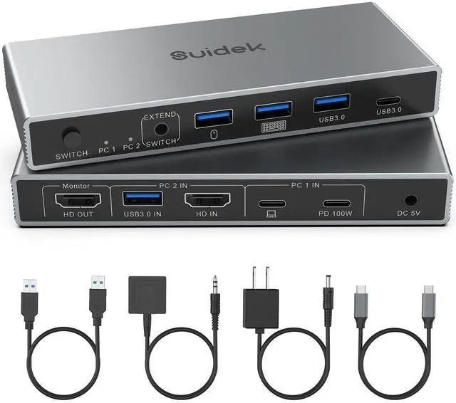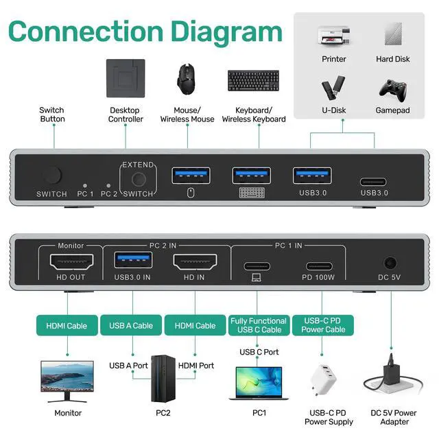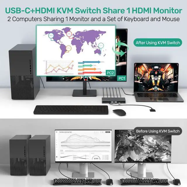 Monitor: Connect 2 computers (e. g., a USB-C laptop and a standard HDMI PC) to a single monitor, sharing up to 4 USB peripherals including keyboard, mouse, hard drive, and printer. Seamlessly switch between work, gaming, or home setups with the press of a single button of 4k KVM switch.