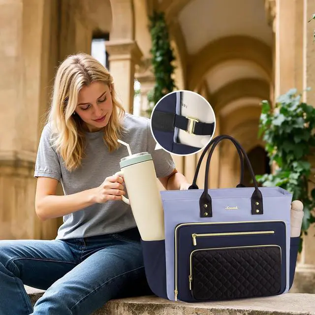 With Large Cup Holder: Designed for your large water bottle, our laptop tote bag features an elastic side pocket that holds up to 30oz. The innovative design allows the cup's handle to fit perfectly, ensuring stability and easy access. This dedicated side pocket is ideal for those always on the go, combining style with functionality. Ideal for professionals, travelers alike. ^^ Ample Storage & Padded Laptop Compartment: this laptop bag features a padded laptop sleeve for excellent impact protection, ideal for work, business, travel, or everyday use. The spacious main compartment easily accommodates books, folders, and more, making it versatile as a teacher bag or nurse bag. Perfect for new parents as a diaper bag, it organizes baby essentials like clothes, diapers, and bottles efficiently. ^^ Work & Travel-FriendlyEffortlessly blend style and function with our versatile tote bag, designed for the modern traveler. Featuring a luggage sleeve for easy carry-on attachment, adjustable, removable shoulder straps, and sturdy handles. Made from premium waterproof, scratch-resistant material, its your ultimate work, commute, daily use and business travel companion. ^^ Perfect for