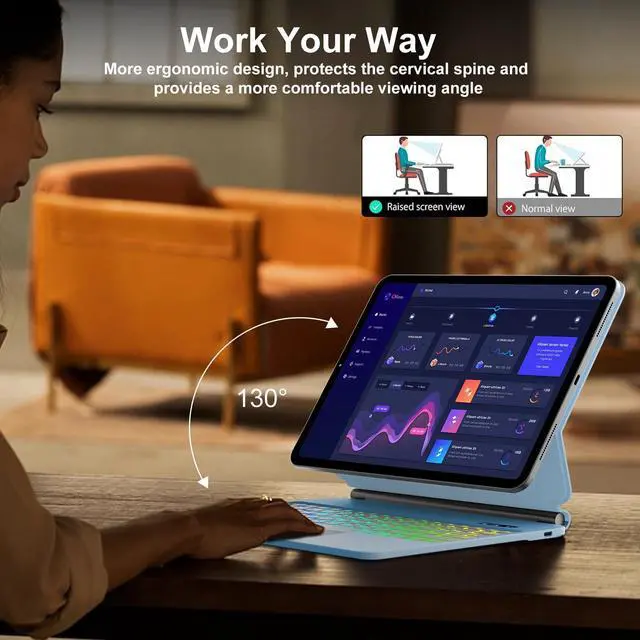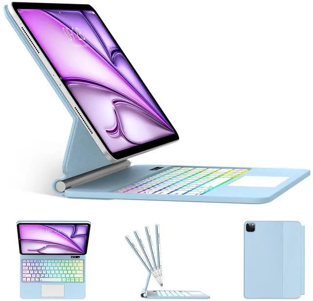 Type Day and NightThis for ipad air 11 inch keyboard has Rainbow backlit with 7 combinations. Click"Fn and Light "key together to adjust 3 different levels of brightness, ensuring comfortable use under different lighting conditions. Click "Fn and RGB" key together to switch color of backlight. After click them 7 times, it will switch to breathing light mode, the backlight color will automatically switchincreasing fashion sense of the keyboard while pr