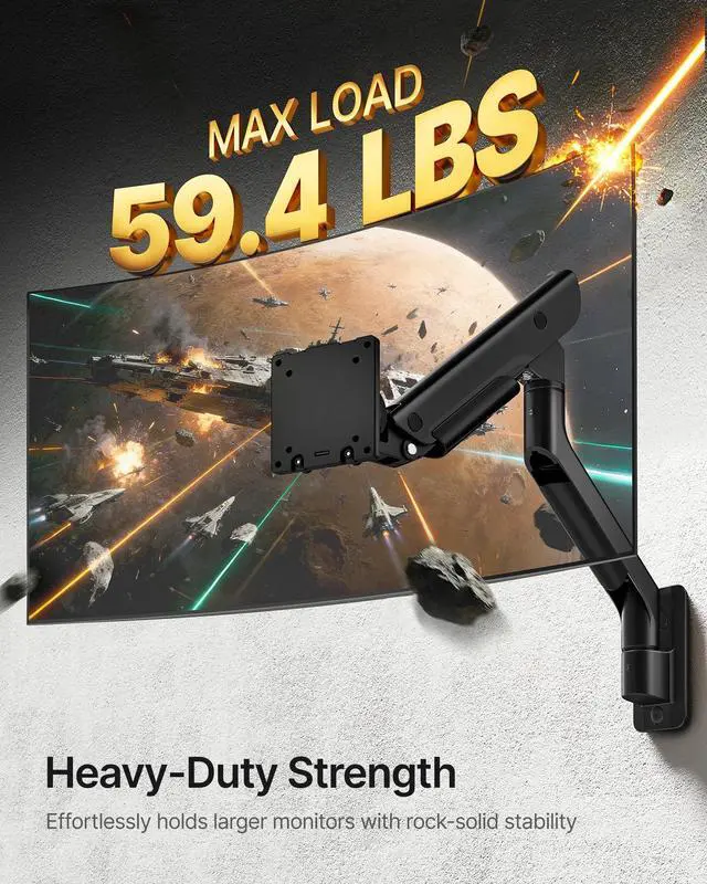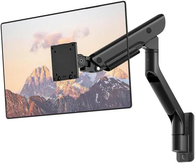 Compatible with 75x75mm and 100x100mm VESA patterns, this monitor wall mount ensures rock-solid support for larger and heavier screens. ^^ Premium Aluminum BuildCrafted from premium-grade aluminum with a remarkable 98% purity, our wall mount monitor arm combines strength, durability, and a sleek professional look. It stands up to frequent adjustments while maintaining a clean aesthetic that complements any valuable setup. ^^ Full Ergonomic FlexibilityThis wall mount achieves your optimal viewing posture with extensive flexibility. Enjoy effortless ergonomic tuning with +60 to -50 tilt, 90 swivel and 90 rotation. Easily extend your screen up to 24.3 from the wall or fold it back to 5.2", with a 11.6 height range to match your perfect and healthy posture for gaming, work, or exercising, etc.
